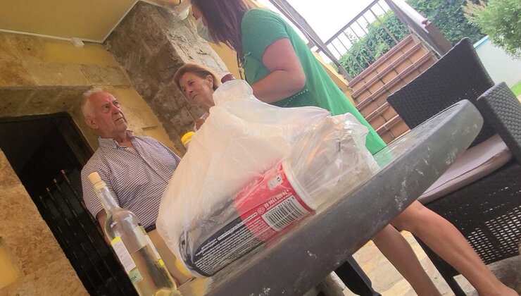 Nadat ik al een tijdje met een volle vuilniszak rondliep werd het tijd om al die bierblikjes, mondkapjes en andere plastic zooi om te ruilen voor 'iets van waardering'. Mijn 2 meter lange lichaam is vaak erg handig om over schuttingen heen te kunnen kijken. Zo kon ik nu ook makkelijk contact maken met een vriendelijke vrouw die mijn verhaal graag aanhoorde. Ze nodigde me uit om de tuin in te lopen terwijl zij naar de keuken snelde en mij achterliet met haar dementerende moeder die zij verzorgde. Haar slechthorende vader strompelde uit het huis om te kijken wat er aan de hand was. Voordat ik een slecht lopend Spaans gesprek kon afronden met haar vader en moeder kwam de vriendelijke vrouw alweer naar buiten met een zak vol met eten: een half stokbrood met gebakken ei, een banaan en een koud biertje.