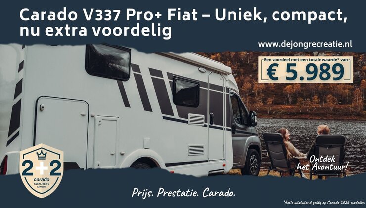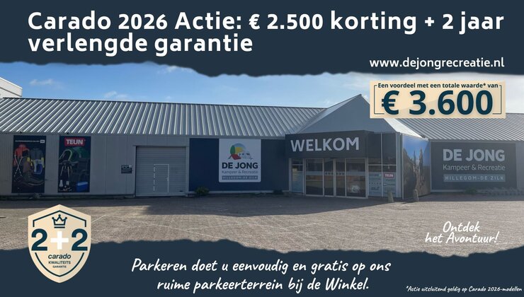 Bij aankoop van een gloednieuwe Carado 2026‑camper bij DE JONG Kampeer & Recreatie profiteert u van: