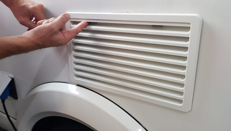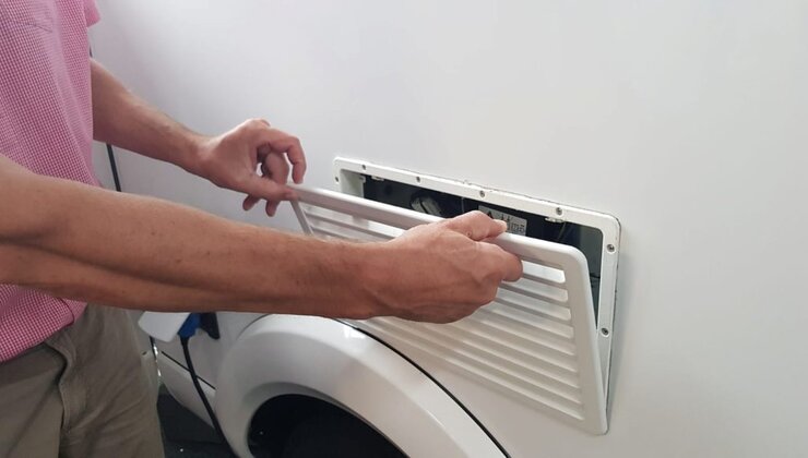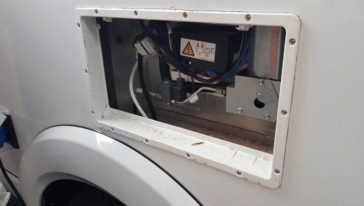 [Foto 1] Verschillende campers hebben verschillende manieren om het rooster te kunnen verwijderen. De ene keer is het een schuifje aan de buitenkant, de andere keer een schroefje dat met een muntje opengedraaid moet worden en zoals op deze foto’s soms ook aan de hand van een schuifje aan de binnenkant.