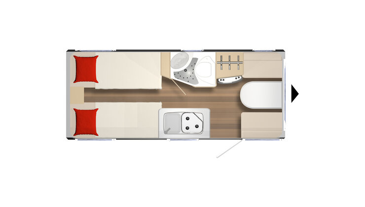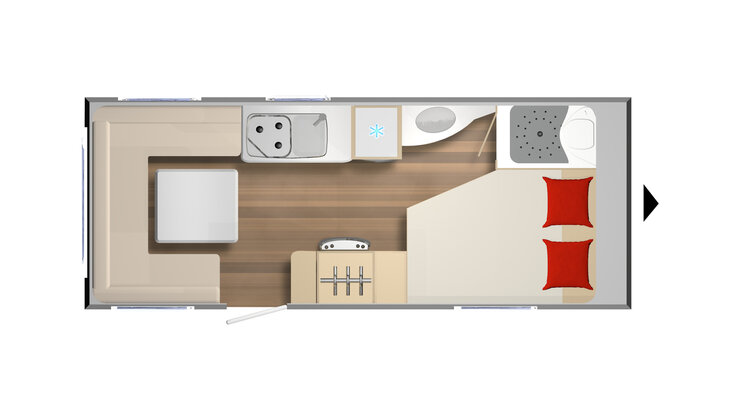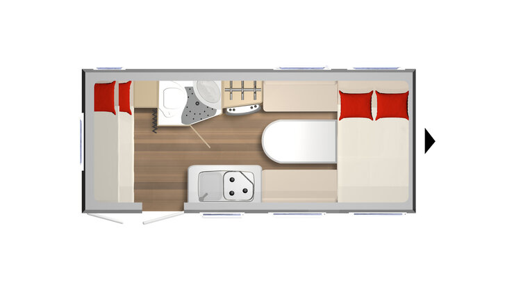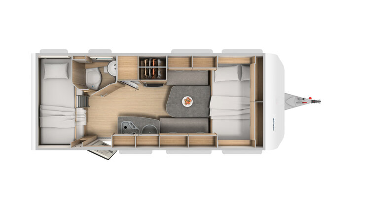 De Eriba Nova Light 515 heeft een stapelbed achterin de caravan. Ook de toiletruimte is achterin te vinden. Voorin zijn er nog drie slaapplaatsen te vinden. Dit zorgt ervoor dat er 5 slaapplaatsen zijn in de Nova Light 515. De keuken is in het midden te vinden en de zitgroep in het midden/voorin. Ook zijn er veel opbergruimtes in de Nova Light. Zo heeft deze indeling alles om te gaan genieten van een welverdiende vakantie.