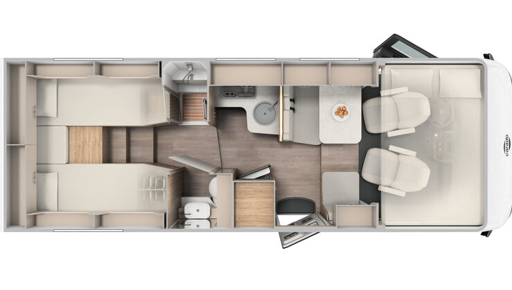 De gezellige zitgroep, goed uitgeruste keuken en een complete douche- en toiletruimte maken deze Bürstner de perfecte keuze voor uw volgende reis.