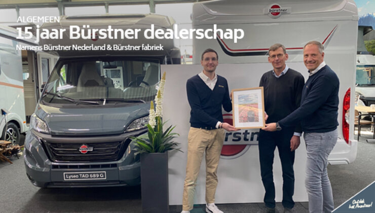 DE JONG viert 15 jaar Bürstner dealerschap! Deze prachtige onderscheiding is uitgereikt door Robin namens Bürstner Nederland en Luc namens de Bürstner fabriek.