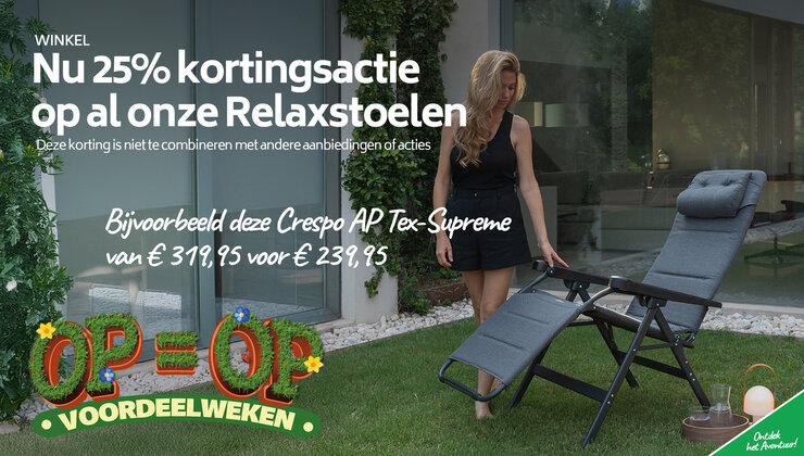 Van 1 t/m 10 mei profiteert u van maar liefst 25% korting op al onze relaxstoelen. Een heerlijk moederdagcadeautje of een hele fijne toevoeging aan uw reis of voor in de tuin!