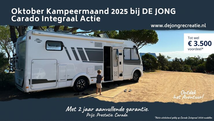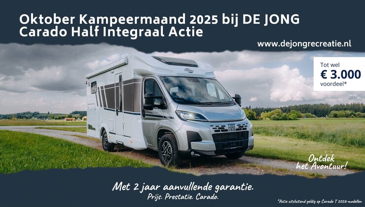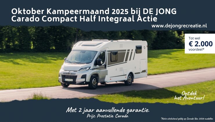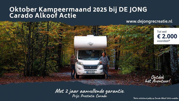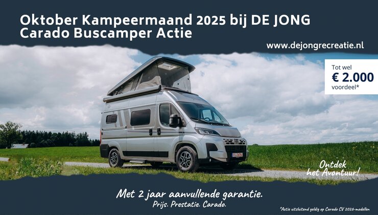 De actie ‘Prijs. Prestatie. Carado.’ loopt t/m 15 november 2025 bij DE JONG Kampeer & Recreatie. Kom tijdens de Oktober Kampeermaand naar onze Showroom in Hillegom-De Zilk, ontdek het actueel aanbod Carado-modellen en bespreek samen met onze verkoopadviseurs welk 2026 model van Carado het beste bij uw reisstijl past.