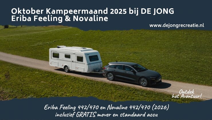Ja, ik ben geïnteresseerd >Profiteer bij DE JONG Kampeer & Recreatie van een unieke Eriba Eindejaarsactie! Bij aankoop van een Eriba Feeling 442 / 470 of Eriba Novaline 442 / 470 voorraadmodel van modeljaar 2026 ontvangt u tijdelijk, en zolang de voorraad strekt, een gratis Al-Ko Mammut Mover met standaard loodaccu. Dit biedt optimaal gemak bij het rangeren van uw caravan en maakt uw vakantievoorbereiding nog eenvoudiger.