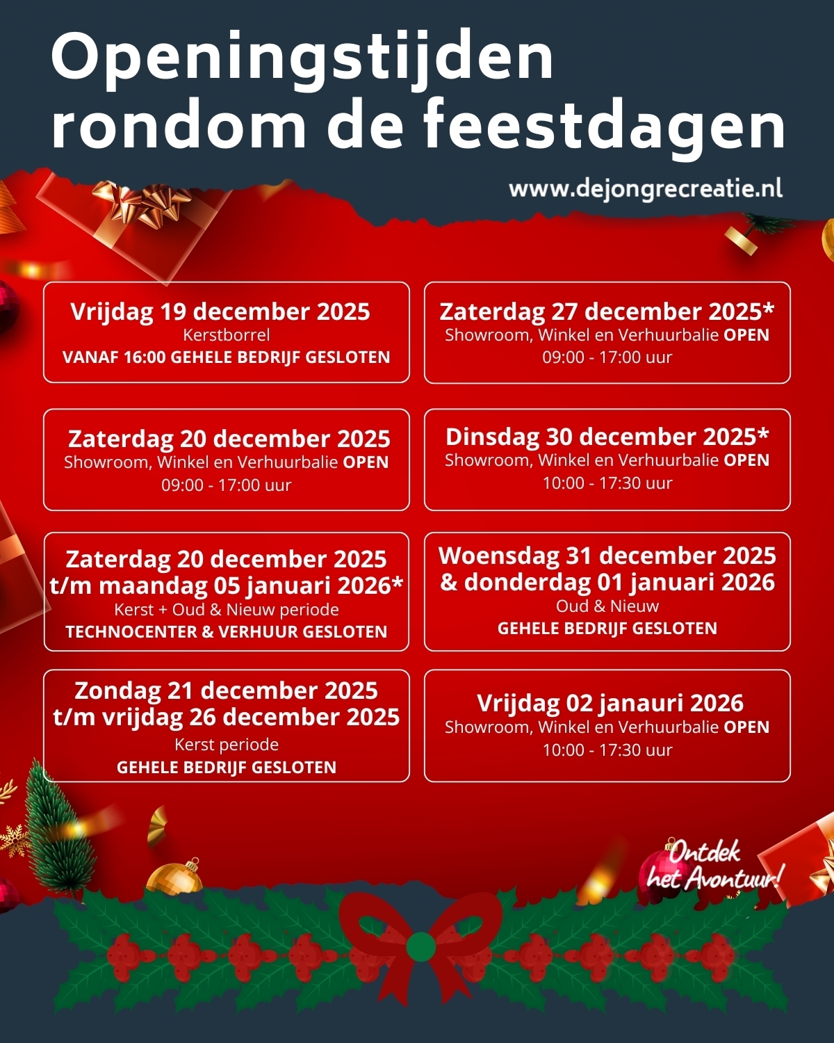 Tijdens de Kerst & Oud en Nieuw periode* zijn er bij DE JONG Kampeer & Recreatie afwijkende openingstijden. Om ervoor te zorgen dat u niet voor een dichte deur komt te staan raden wij u aan om het overzicht op deze pagina te raadplegen.