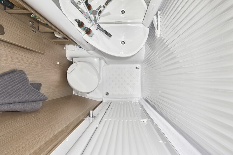 Compacte spa: Afhankelijk van het model zijn in de sanitaire ruimte de douche en het toilet gecombineerd of afzonderlijk ingedeeld. Alle modellen zitten boordevol praktische elementen, zoals grote spiegelvlakken, ingebouwde ledspots en een cassettetoilet.