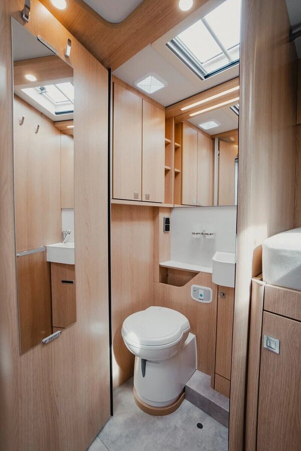 Het interieur van de Hymer B-MC I BlackLine is ontworpen voor optimaal comfort, met een slimme indeling, luxe bedden en een royale keuken voorzien van een 142-liter koelkast. De slaapruimte biedt flexibiliteit, met keuze uit ruime eenpersoonsbedden of een groot queensize bed. Ook de badkamer is ruim opgezet en beschikt over een grote douchecabine, zodat u onderweg kunt genieten van een luxe douche-ervaring.