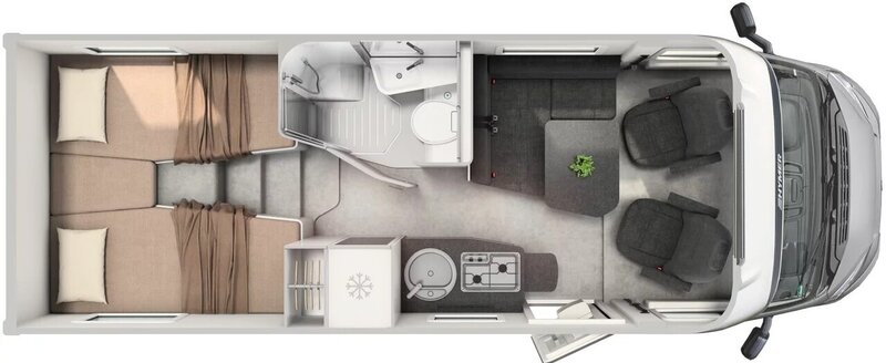 De Hymer Exsis-T 580 Pure heeft achterin twee eenpersoonsbedden. Hier kan eventueel één groot bed van gemaakt worden. De royale toiletruime met douche is luxe ten top. De keuken met ruime koelkast is erg prettig in gebruik. In de keuken kan er een heerlijke vakantiemaaltijd bereid worden. De comfortabele zitgroep maakt deze half integraal helemaal af. Hier kan mede door de draaibare stoelen heerlijk genoten worden na een lange dag vol avonturen. Zo is het met deze lichtgewicht camper erg prettig om prachtige reizen mee te maken.