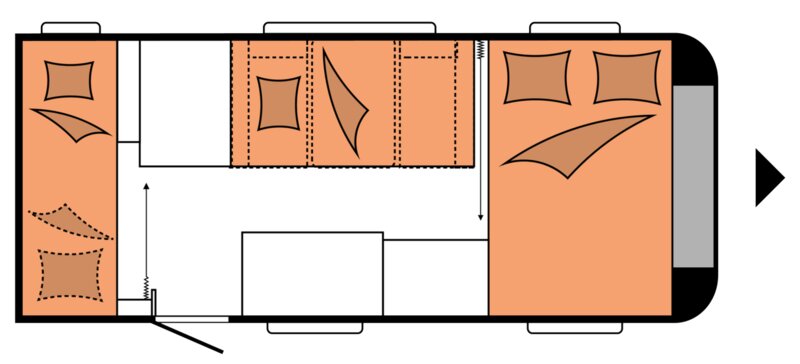 In het midden van de caravan vindt u een gezellige zithoek, die eenvoudig om te bouwen is tot een extra slaapplaats indien nodig. Deze multifunctionele ruimte is ideaal voor gezamenlijke maaltijden of om ’s avonds even fijn te ontspannen.