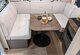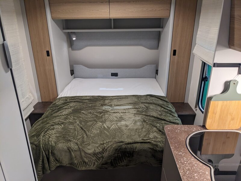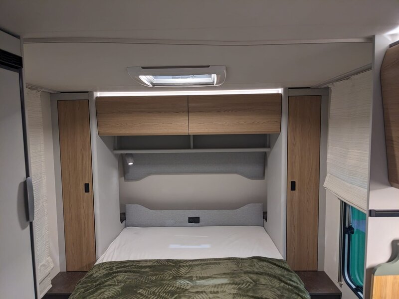 Wat betreft de indeling van de caravan zit u goed. Er is een heerlijk Queensbed (200 x 150) voorin aanwezig. Hier valt er na een dag actief of ontspannen recreëren lekker in te slapen. Verder is er een comfortabele rondzit die om te bouwen valt naar een 2-persoonsbed (205 x 130-110). Een keukenblok met een 3-pitskookplaat en spoelbak. Naast de toiletruimte met wastafel is een hoge koelkast aanwezig. Er bevinden zich hangkasten naast het Queensbes, verder zijn er vele opbergmogelijkheden voor de bagage. Uiterlijk is de buitenafwerking uitgevoerd met een mooie B66 bestickering in grijs en bronstinten.