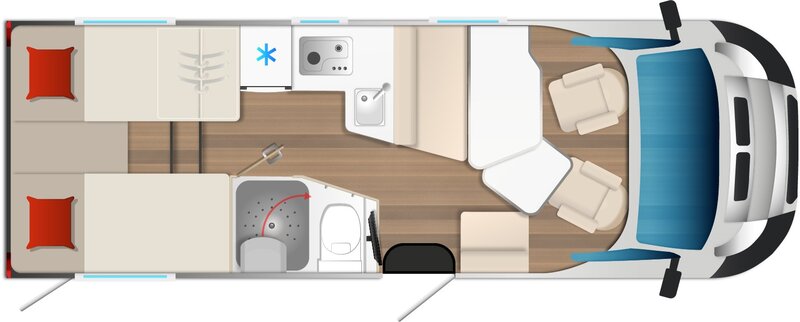 De Campeo TD 691 is de indelingsvariant met enkele bedden en lage koelkast. Hierdoor is deze camper heerlijk ruim en comfortabel. Aan opbergruimte ook geen gebrek, voldoende kastruimte binnen, een dubbele vloer en een zeer grote garage zorgen ervoor dat je alles optimaal kwijt kunt.