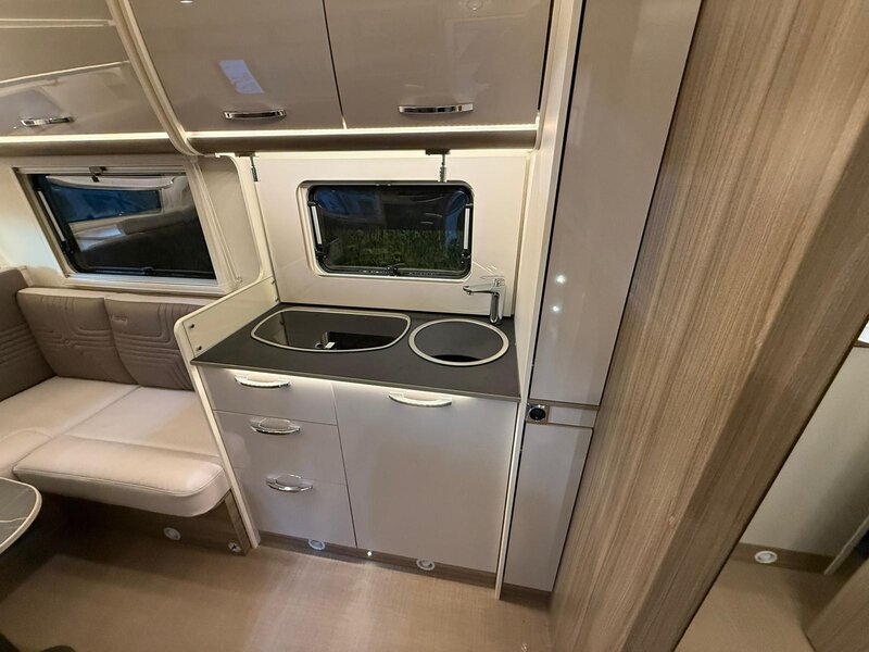 Stijlvolle Afwerking: De warme Sandy Grey kleur en het luxe Harmony Line-pakket geven deze camper de uitstraling van een comfortabel thuis, waar je ook gaat.