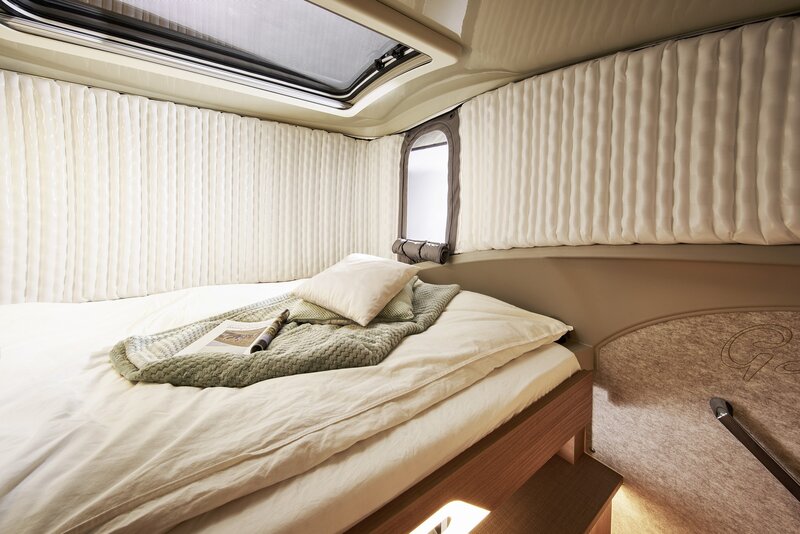 - Luxe cabineverduistering met cassette plissé’s en een lederen stuur