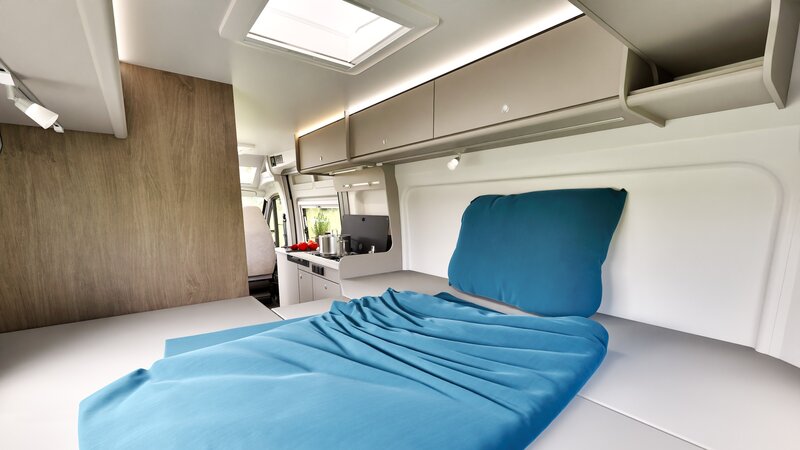 * LED-verlichting boven de bovenkastjes en ruime dakopbergkasten