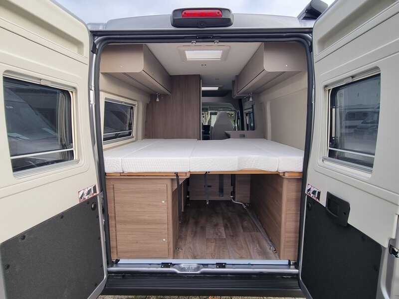 Lengte bedden op nog geen 6 meter. Dat kom je maar weinig tegen. Deze moderne en gunstig geprijsde Carado bus camper met Fiat 140 PK 8 traps automaat heeft het.