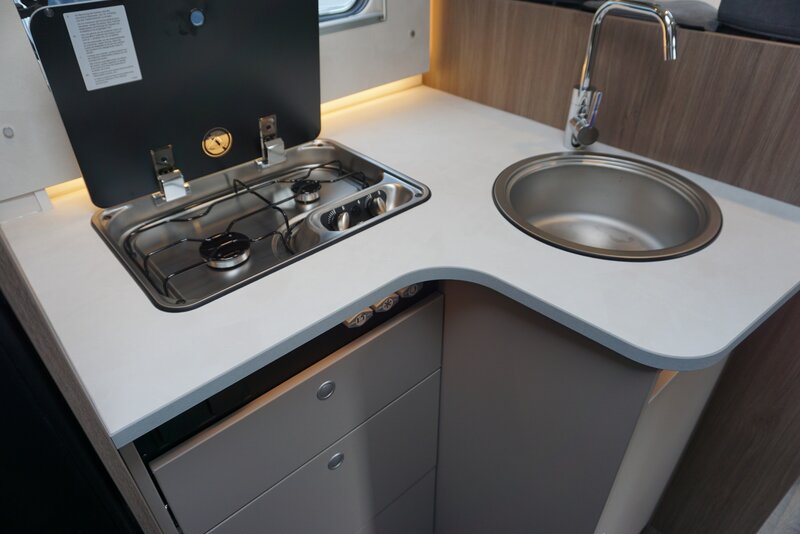 Met een totale lengte van nog geen 7 meter biedt deze Carado verrassend veel leefruimte. De gezellige zitgroep met extra bankje zorgt voor extra comfort en maakt deze camper optioneel geschikt als 5-persoonscamper, met zowel vijf geregistreerde zitplaatsen als vijf slaapplaatsen.