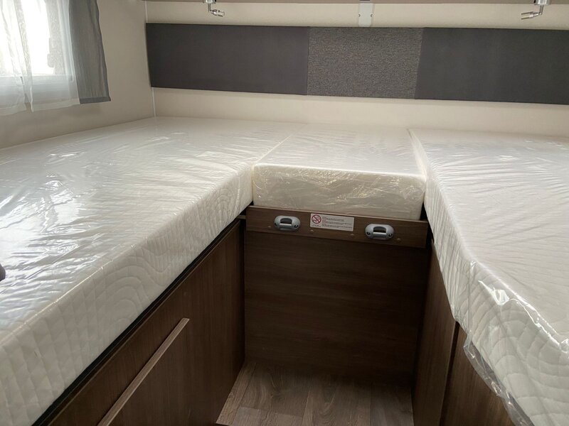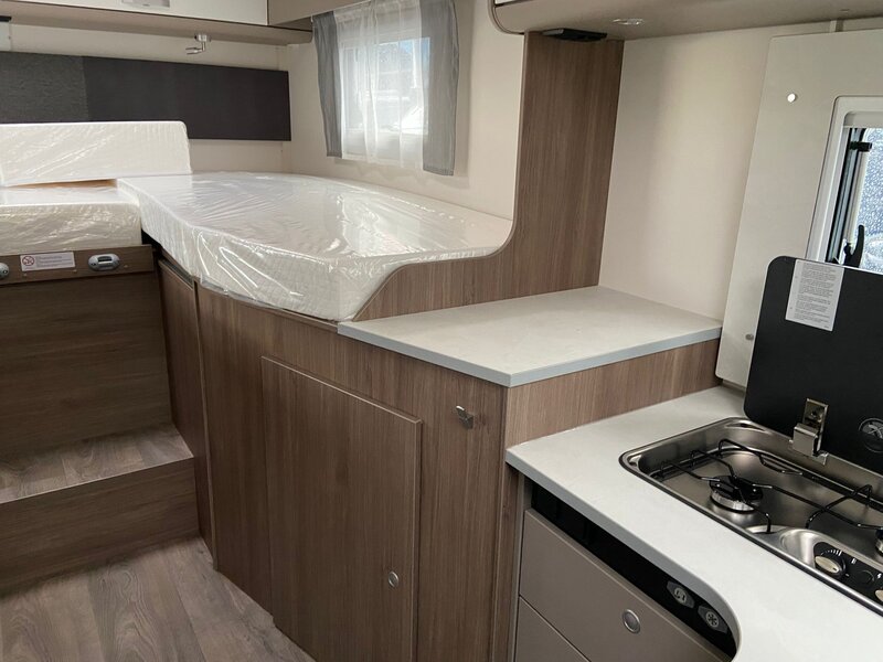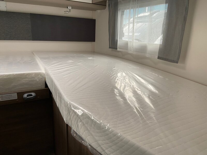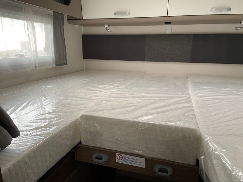 De Carado T 338 is een fijne half integraal camper met enkele bedden welke eenvoudig te wijzigen is in één groot bed. Onder deze bedden bevindt een grote garage die door zowel een garagedeur links als rechts te bereken is.