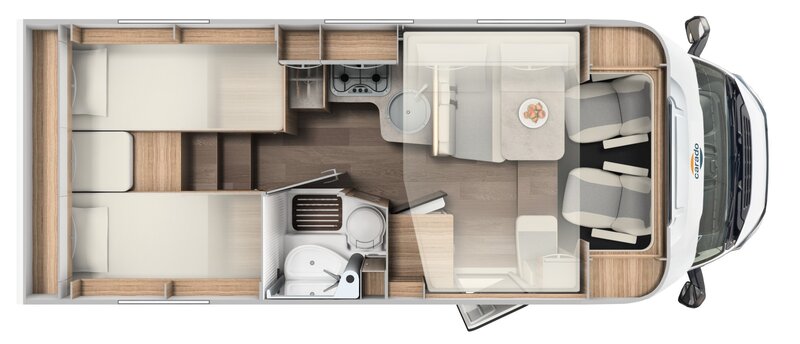De Carado T 338 is een moderne half integraal met enkele bedden welke om te bouwen zijn naar één groot tweepersoonsbed. Hiernaast heeft deze populaire indeling een ruime zitgroep , een heerlijke L – keuken en een prima douche – toiletruimte . Met een lengte van onder de 7 meter kom je met deze Carado op de allerleukste plekken en geniet je van veel comfort zowel tijdens de reis als op plaats van bestemming. De 140 Pk met 8 trap volautomaat is soepel en krachtig en trotseert ook gemakkelijk de steile bergweg naar dat porachtige puntje met een geweldig uitzicht. Genieten doe je hier van alles dat deze Carado brengt. De Pro+ uitvoering is extra compleet en beschikt over alles dat je maar wensen wil zoals onder andere: