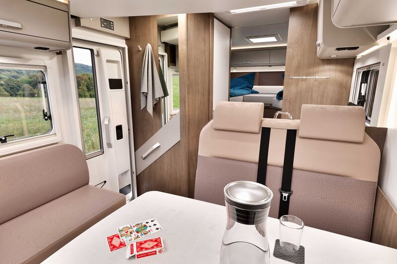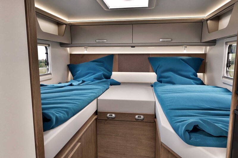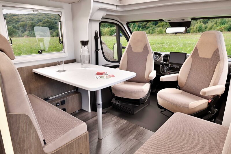 Onder de bedden bevindt zich een grote garage, ideaal voor fietsen en bagage. De ruime douche- en toiletruimte zorgt voor extra comfort, ook tijdens langere reizen. De gezellige zitgroep, gecombineerd met draaibare pilotenstoelen, biedt volop leefruimte en nodigt uit tot ontspannen avonden.