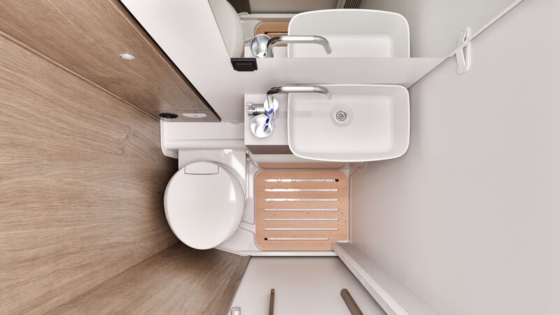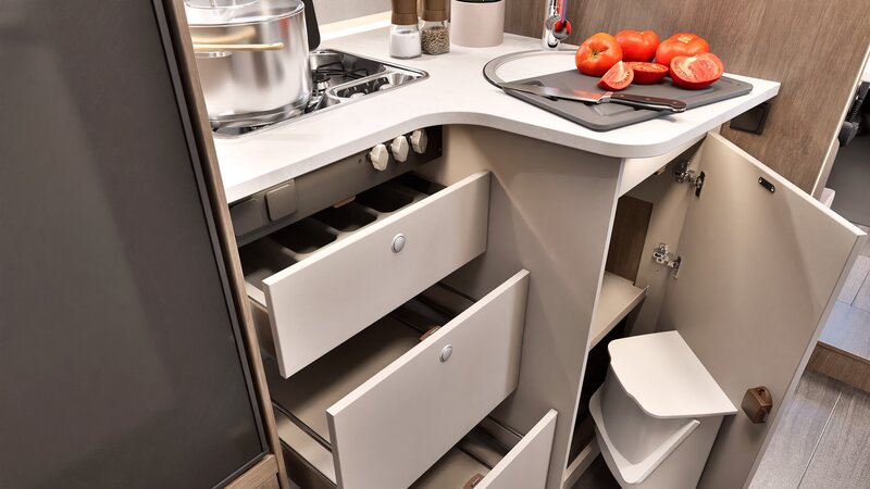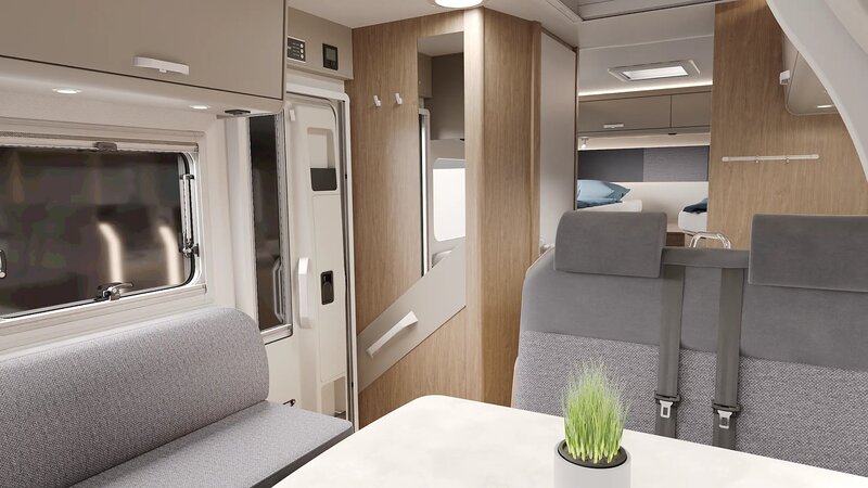 De ruime garage onder de bedden biedt volop plek voor fietsen en bagage. De aparte douche- en toiletruimte en de gezellige zitgroep met draaibare stoelen zorgen voor optimaal comfort onderweg.
