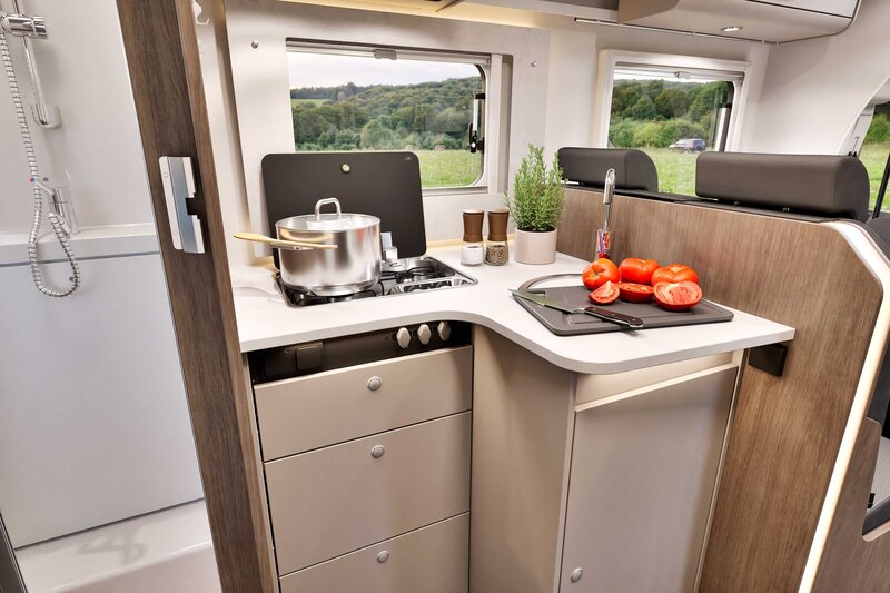 Onder het queensbed vindt u een ruime garage met voldoende plaats voor bagage, fietsen en andere vakantie-uitrusting. De royale douche- en toiletruimte zorgt voor extra gemak en comfort onderweg. In het leefgedeelte vormt de zitgroep samen met de draaibare pilotenstoelen een open en aangename ruimte. Het moderne interieur met een warme uitstraling draagt bij aan een ontspannen en huiselijke sfeer.