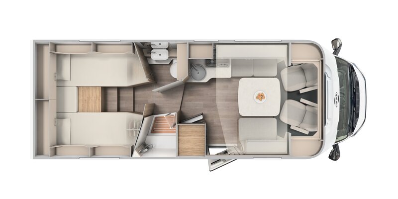 De Carado T 457 is een ruime betaalbare half integraal met enkele bedden en face to face zit uit het toonaangevende Erwin Hymer concern. Goede campers bouwen voor een betaalbare prijs, deze filosofie komt ook bij deze Carado weer helemaal naar voren.