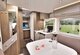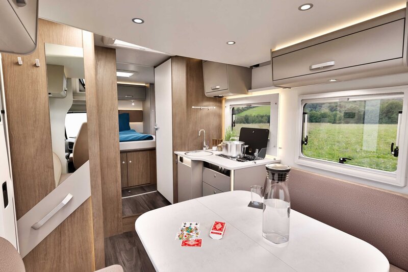 De T 459 biedt een prettig open leefruimte met een comfortabele zitgroep, waarin de draaibare pilotenstoelen naadloos worden geïntegreerd. Hierdoor ontstaat een gezellige en praktische plek om te ontspannen, te eten of samen de dag door te nemen.
