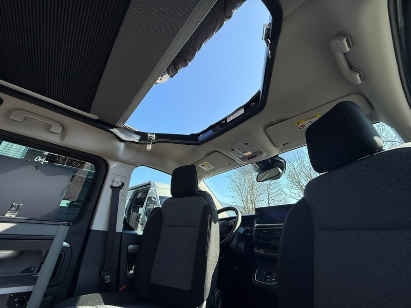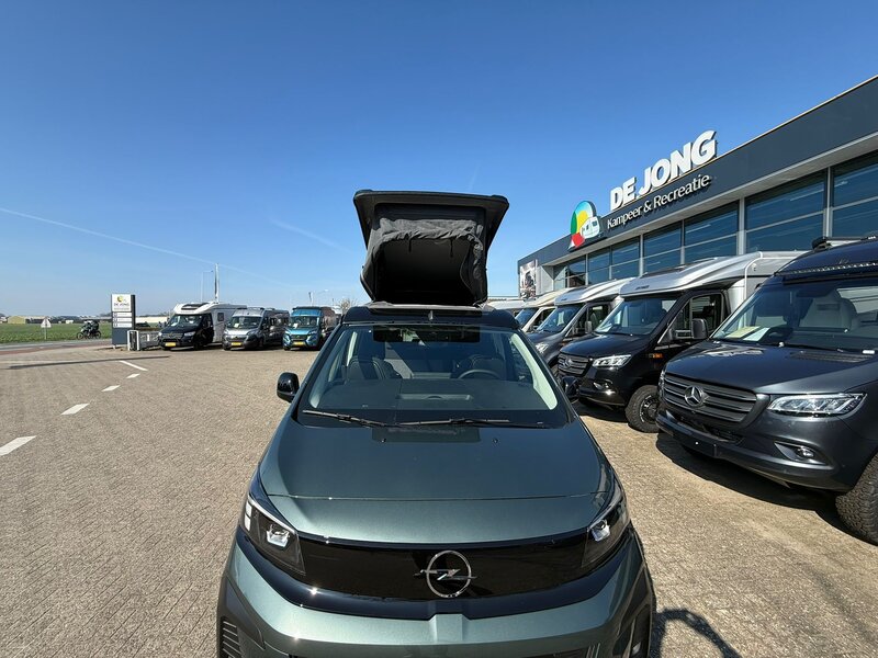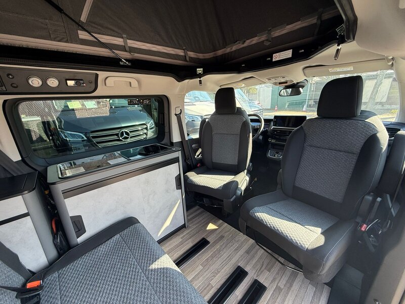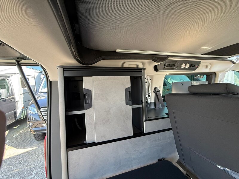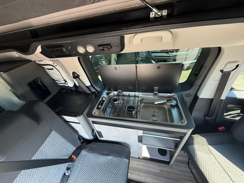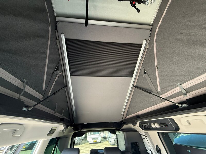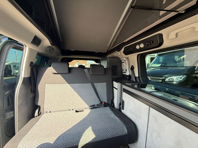 Het interieur is stijlvol en doordacht: Makalu Pearl grijs met Trace donkergrijs accenten en Rimini-bekleding creëren een moderne, warme sfeer. Het panorama slaapdak, airconditioning, twee-zone klimaatregeling en een praktische watervoorziening (22 l vaste watertank en 13 l vuilwatertank) zorgen dat je onderweg en op locatie comfortabel verblijft. Daarnaast is de camper voorzien van een buitenaansluiting voor gas, water en stroom, inclusief buitendouche.