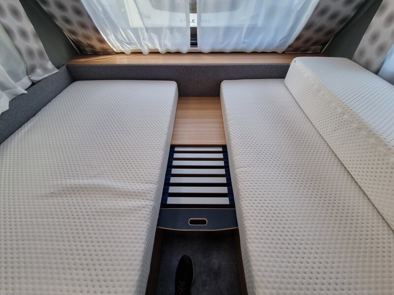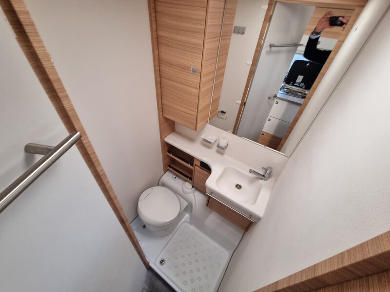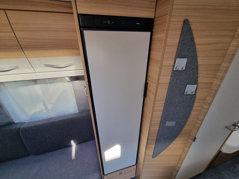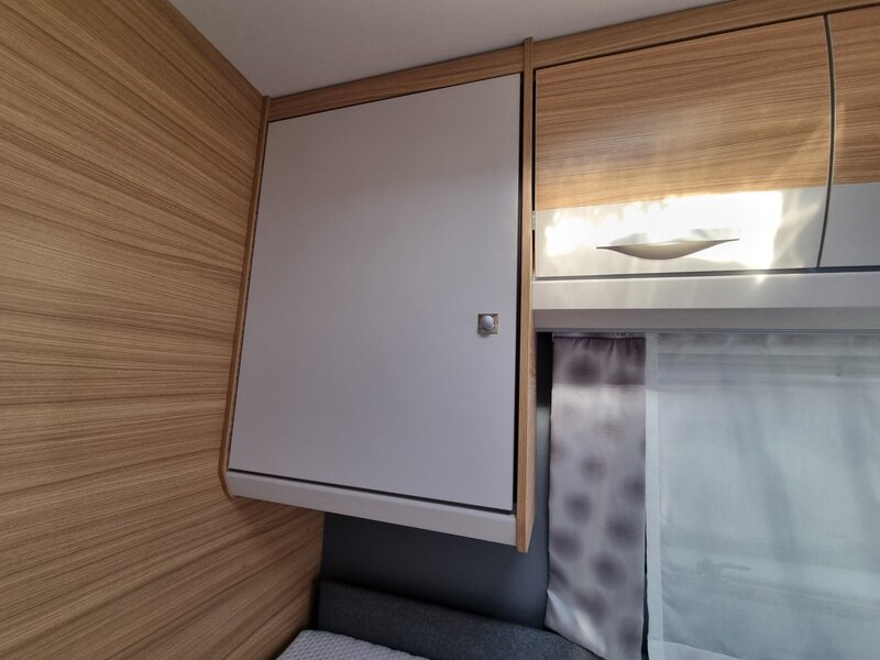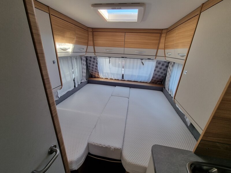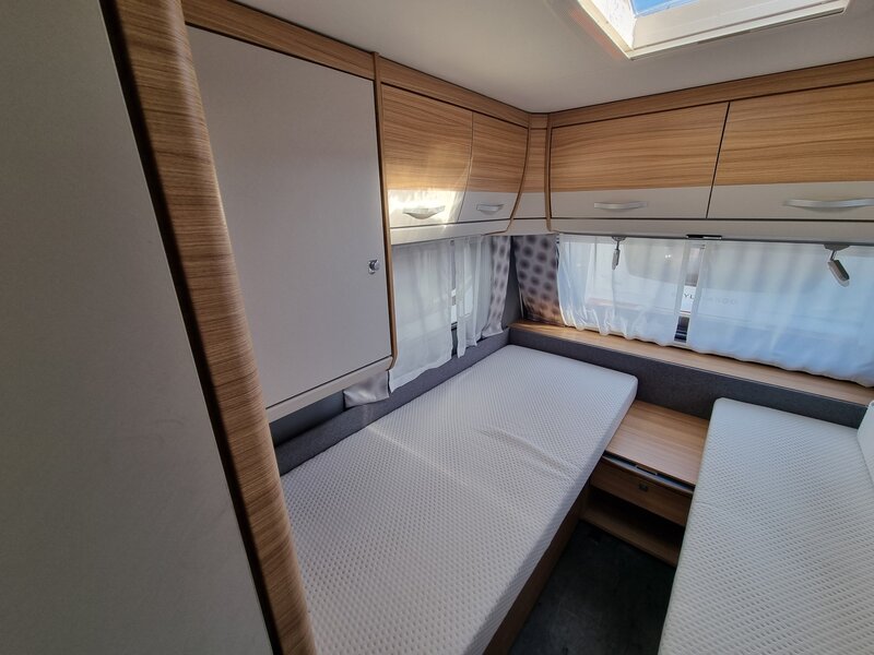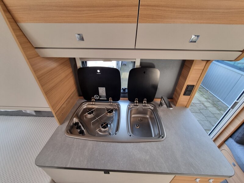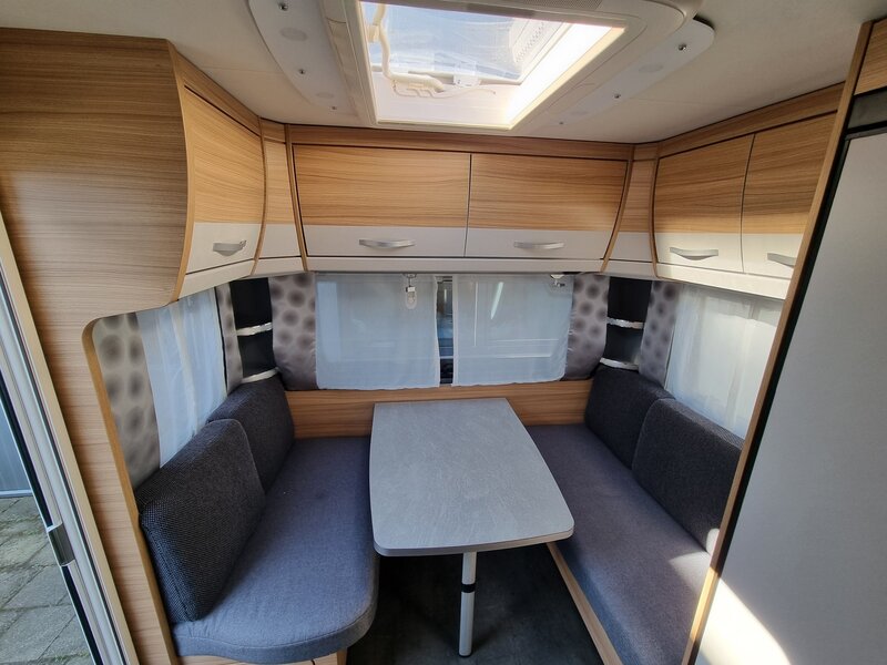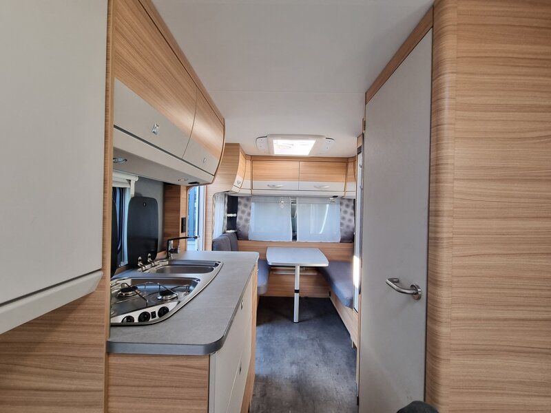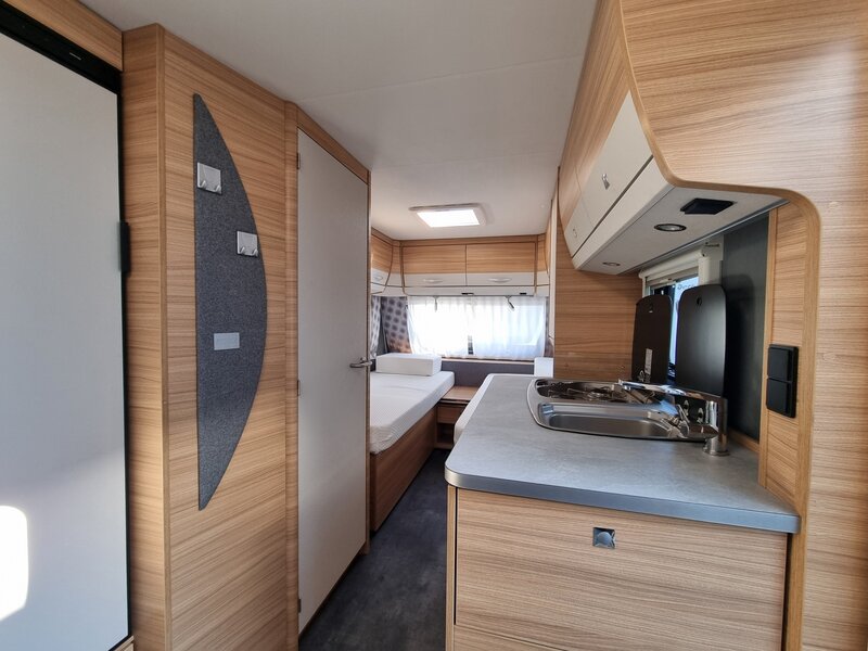 Door zijn fraaie strakke lijnen en modern uiterlijk biedt deze caravan alles voor de kleine en grote kampeerders. Een gezellige zithoek achterin, die tot bed om te bouwen is. Verder een mooi keukenblok met een 3-pits gaskookplaat, spoelbak en voldoende opbergruimte. De hoge koelkast met vriesvak geeft voldoende ruimte om de producten lekker koud te houden. Verder beschikt de caravan over een ruime toiletruimte met wastafel. In de caravan zijn voldoende opbergmogelijkheden voor bagage en andere benodigdheden. En de lengte bedden zorgen voor een heerlijke nachtrust na een dag lekker erop uit.