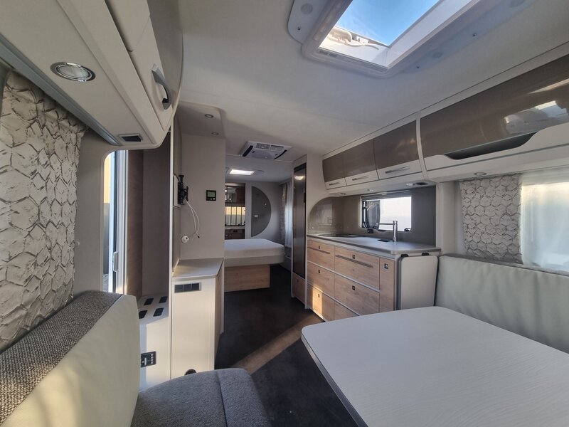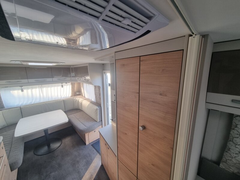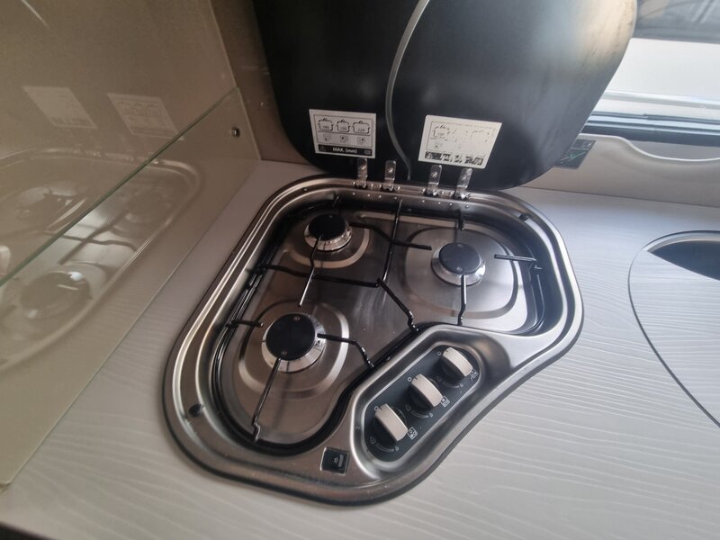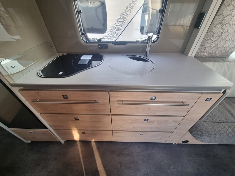 De caravan beschikt over een slimme indeling en een compleet uitgeruste keuken met verlengt aanrechtblad die webklapbaar is.