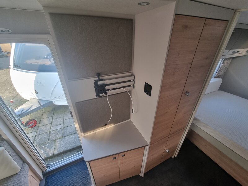 Wilt u een keer een avond net als thuis of komt het met bakken uit de hemel vallen dan verleent deze caravan een prima onderkomen inclusief luxe tv beugel om uw eigen aangekochte led smart tv te kunnen gebruiken voor extra comfort.