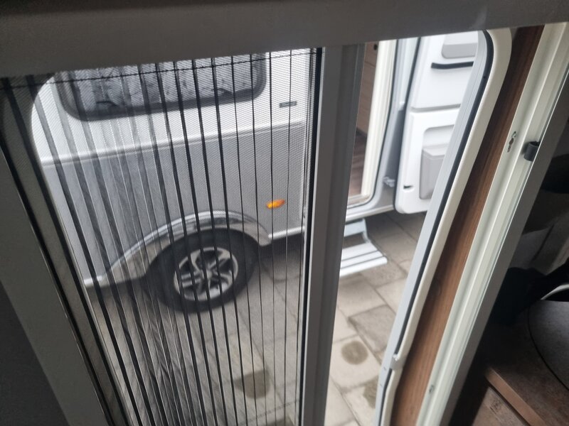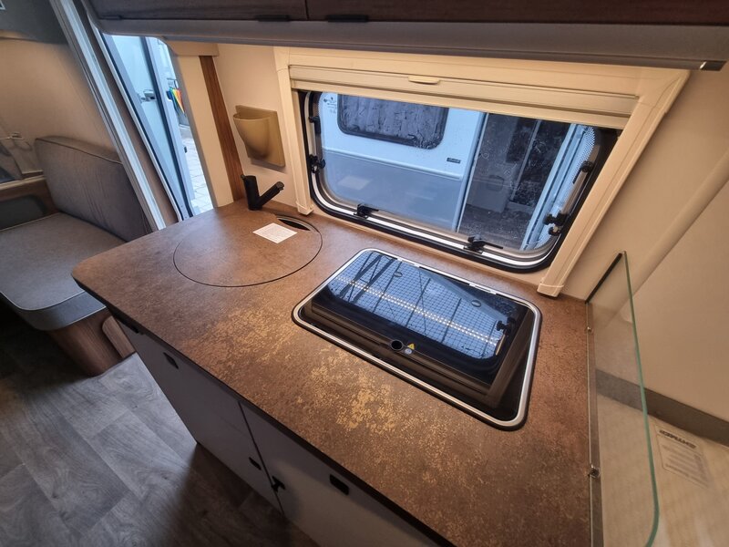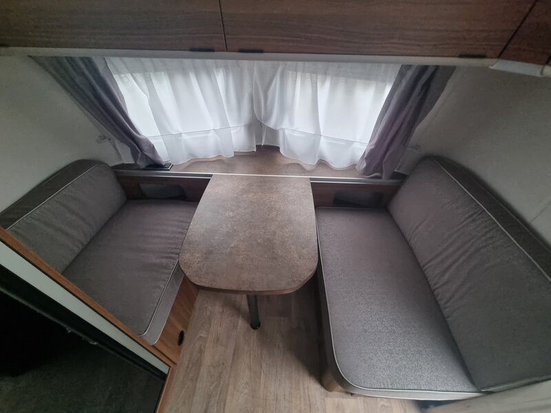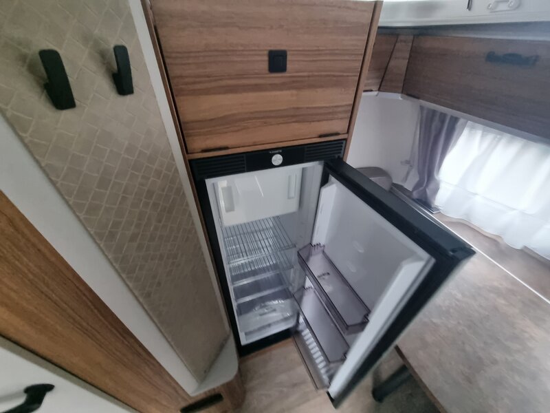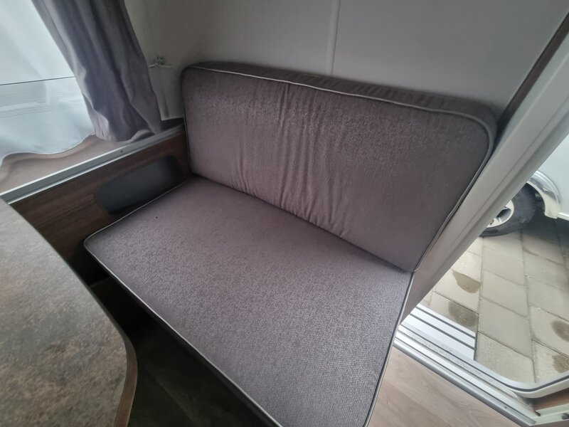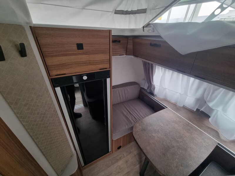 Optimale indeling een ruime middenkeuken, die voorzien is van een 2-pis gaskookplaat, spoelbak en aanrecht verlenging met aan de overzijde naast de zithoek een hoge koelkast die van twee kanten te openen is. Voorin bevindt zich een gezellige zitgroep die eenvoudig kan worden omgebouwd tot een extra slaapplaats.
