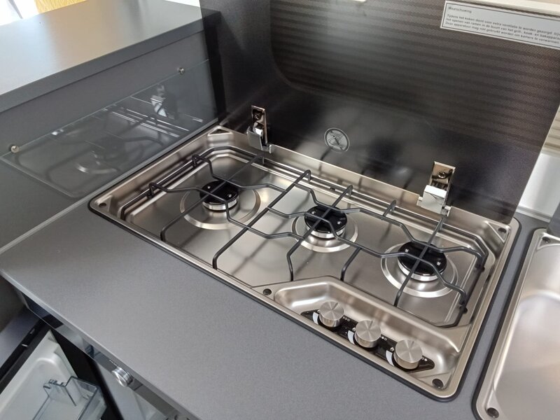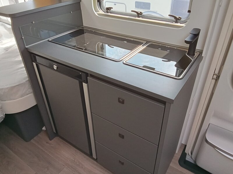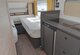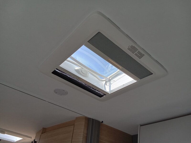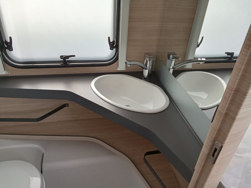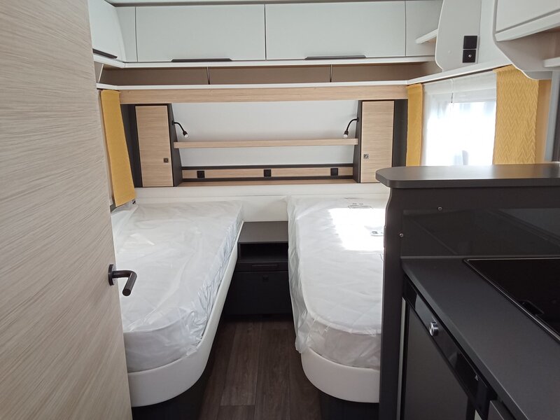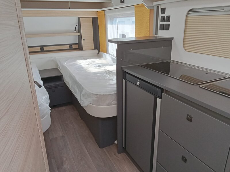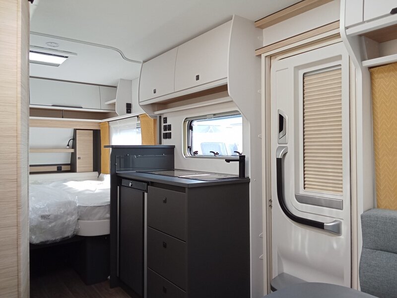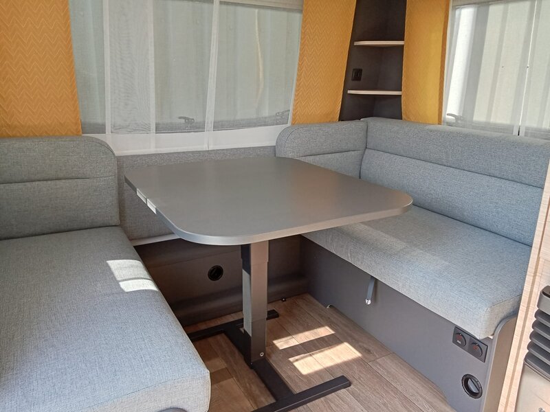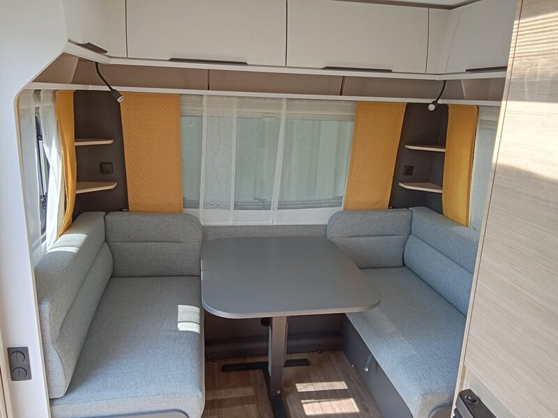 • Eigentijds interieur: Het strakke meubelwerk en de frisse bekleding geven de caravan een moderne uitstraling met een uitnodigende sfeer.