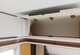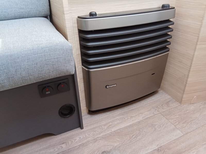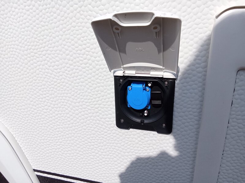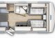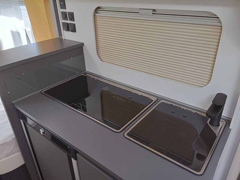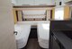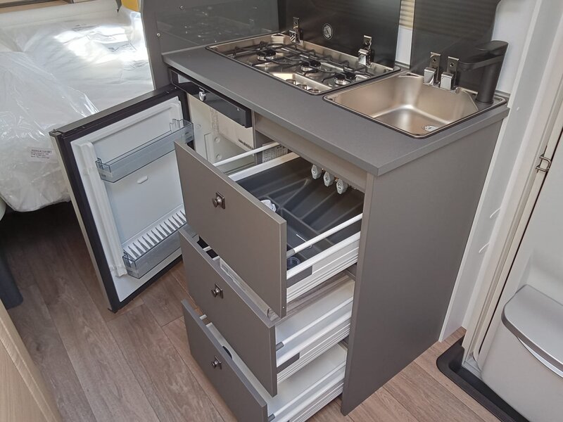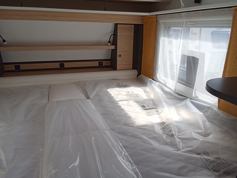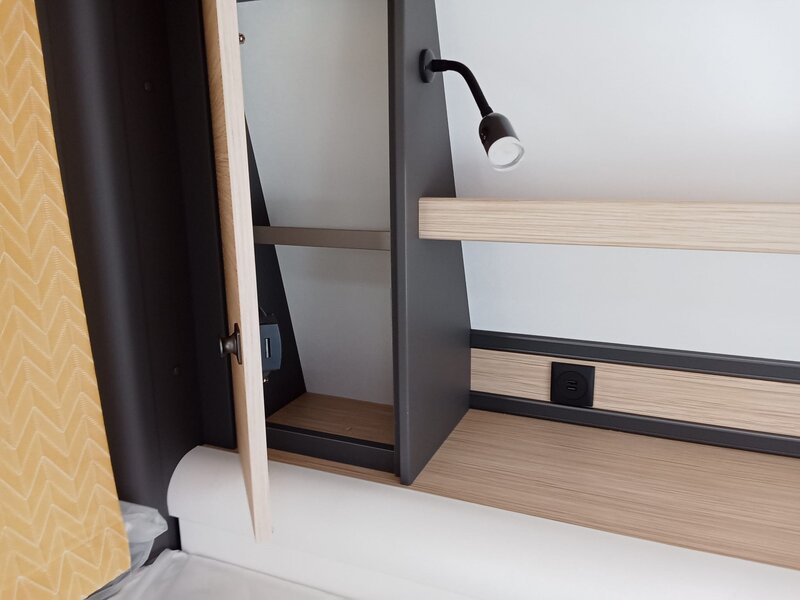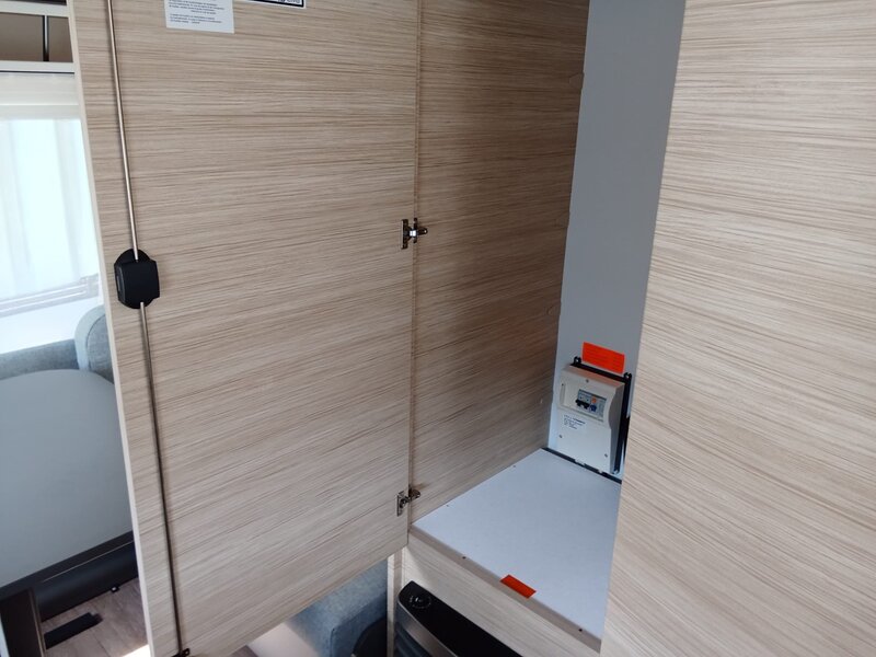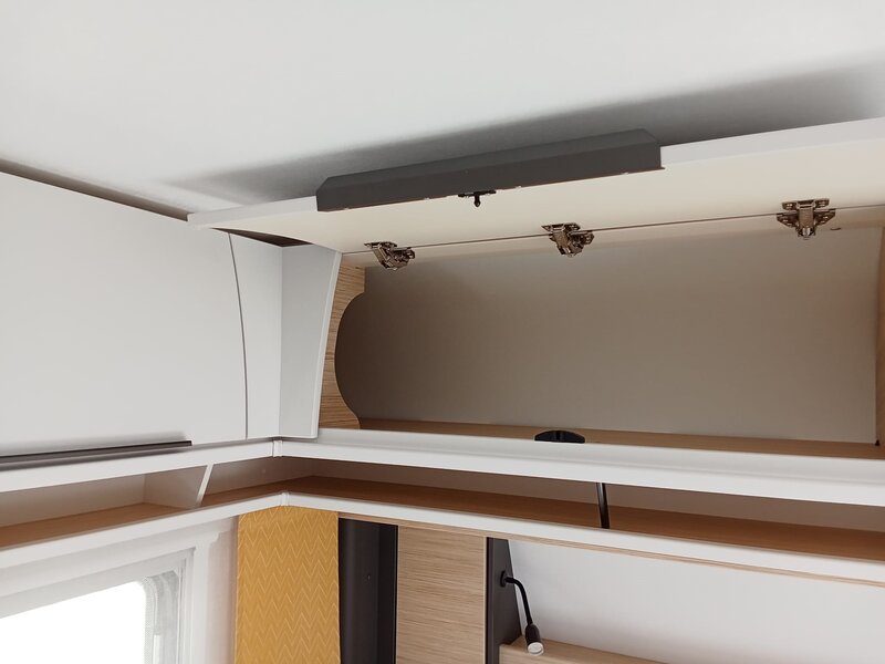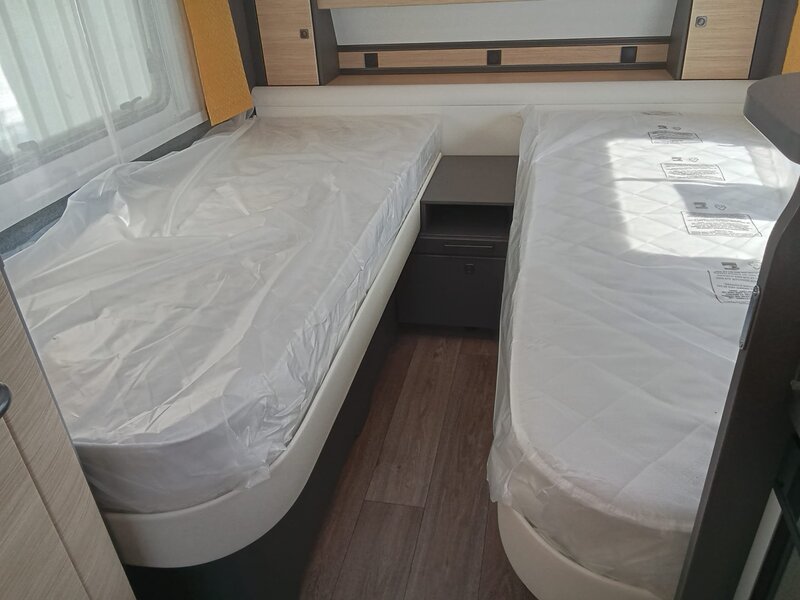 • Eigentijds interieur: Het strakke meubelwerk en de frisse bekleding geven de caravan een moderne uitstraling met een uitnodigende sfeer.