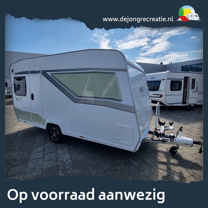 Ideaal voor auto's met een laag trekvermogen en verwonderlijk veel comfort en ruimte voor zijn grootte. De Next 380 heeft fraaie indeling met frans bed, ruime zithoek, keukenblok met spoelbak en 2-pits gaskookplaat, hoge koelkast met vriesvak, hoge kast met legplanken en cassette toilet en een wastafel buiten toiletruimte.
