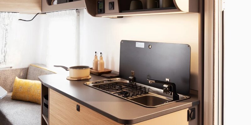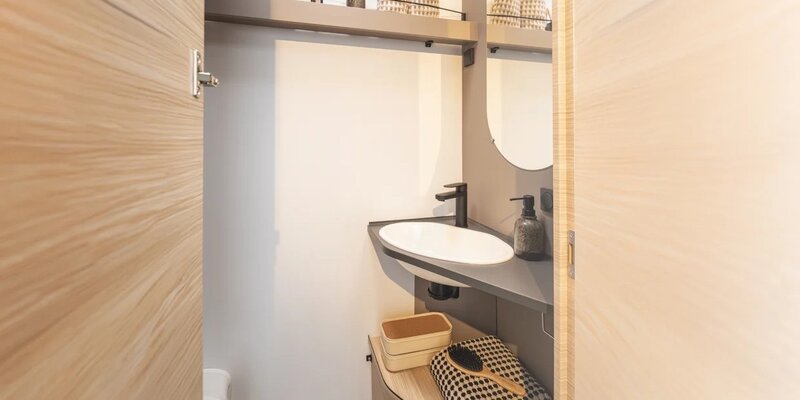 Ook op het gebied van keuken en sanitair is de Nex 381 verrassend compleet. De compacte keuken beschikt over een 2-pits gasstel en een ruime koelkast die van beide zijden te openen is – ideaal voor flexibel gebruik. De nette toiletruimte met wastafel, opbergruimte en verlichte spiegel biedt alles wat je nodig hebt voor onderweg.