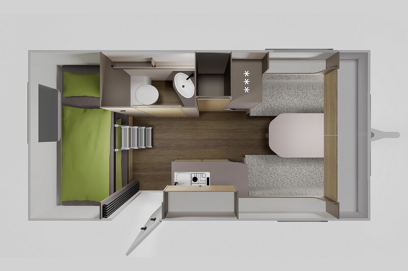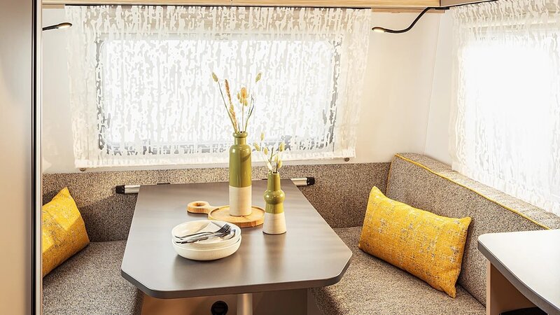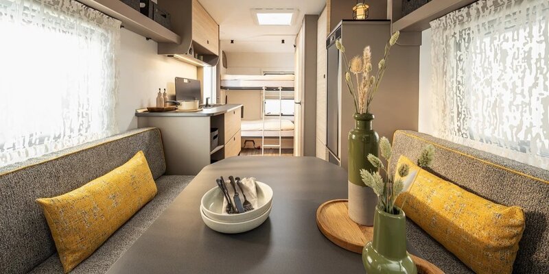 Binnenin word je verrast door een strak en sfeervol interieur waarin comfort centraal staat. De hoogwaardige zitkussens, het verstelbare tafelblad en de slimme indeling maken de zithoek tot een fijne plek om te ontspannen. ’s Avonds tover je deze ruimte eenvoudig om tot een comfortabel slaapgedeelte, ondersteund door een stevig lattenframe en kwalitatieve EvoPore matrassen voor een goede nachtrust.