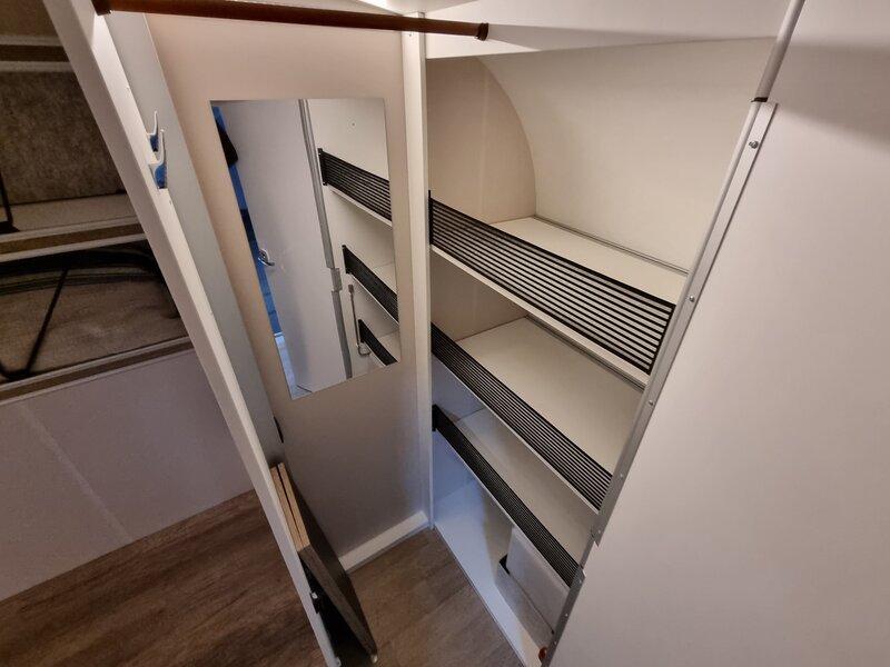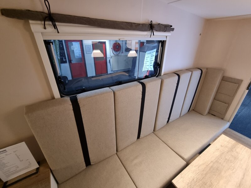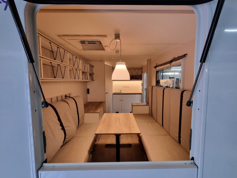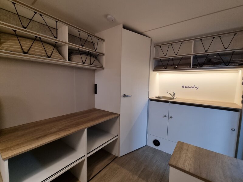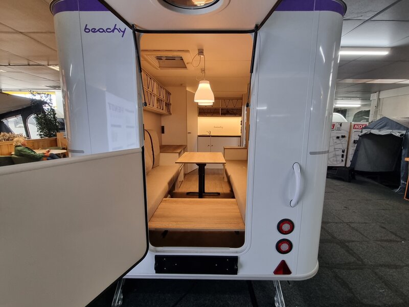 Verder is de Beachy ruim en licht. Het interieur voelt ondanks zijn bescheiden afmetingen aan de binnenkant verrassend ruim aan. Door zijn slimme indeling is het perfect afgestemd op avonturiers. Met een gezellige zithoek die eenvoudig om te bouwen is tot een comfortabel bed, een praktische kitchenette en voldoende opbergruimte, heb je alles binnen handbereik.