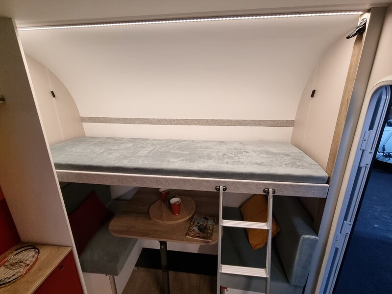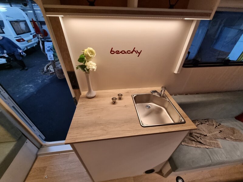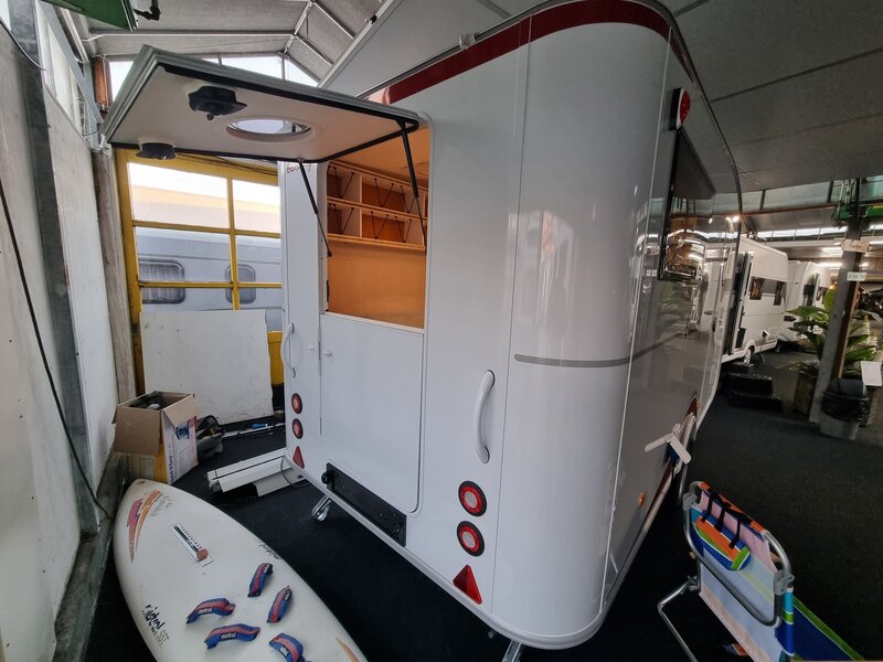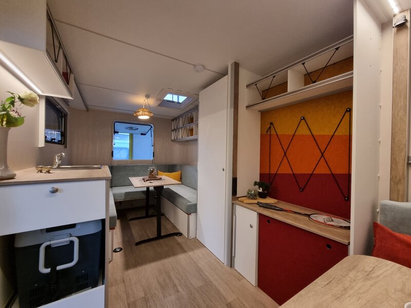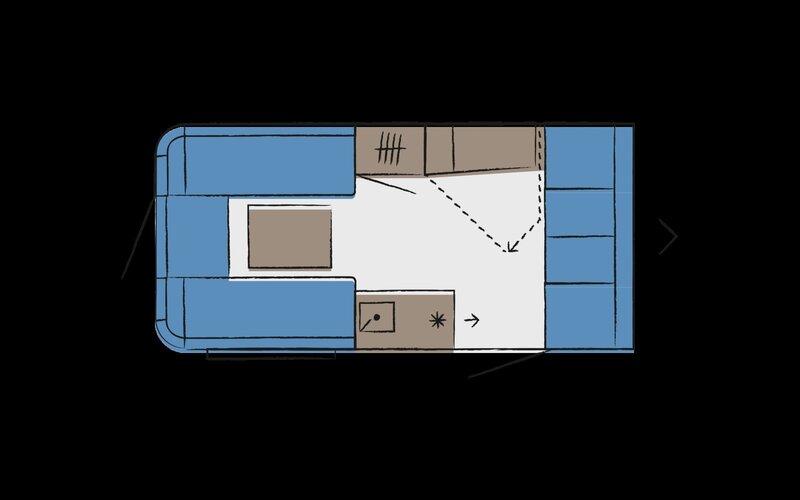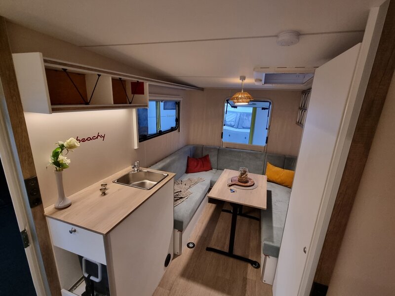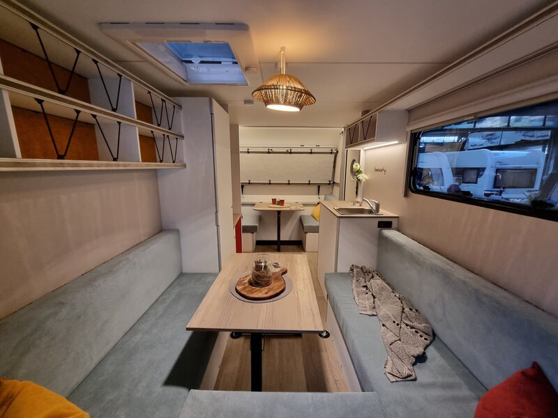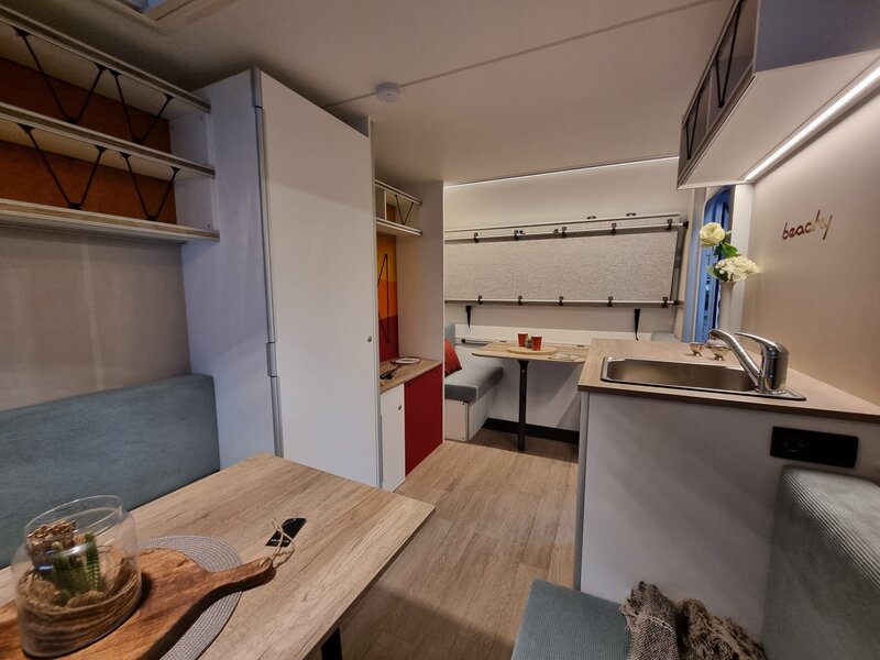 De slimme zithoek is in een handomdraai om te bouwen tot een ruim slaapgedeelte, terwijl de doordachte opbergruimte zorgt dat alles netjes een plek heeft. Dankzij de grote achterdeur haal je het buitengevoel direct naar binnen — ideaal voor stranddagen, roadtrips en ontspannen kampeerweekenden.