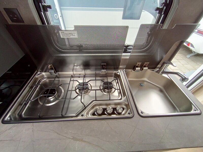 praktische keuken heeft een moderne uitstraling en is van alle gemakken voorzien, inclusief ruime koelkast. Koken onderweg wordt zo een plezier.