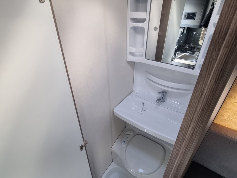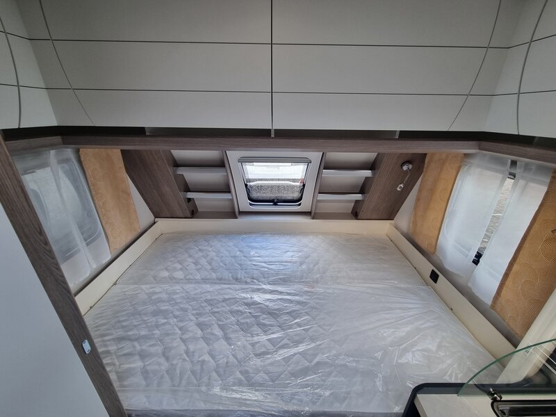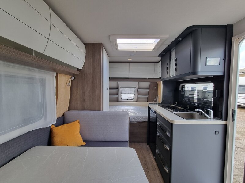 Ondanks zijn bescheiden afmetingen biedt de 390 SF slaapplaatsen voor vier personen: een comfortabel tweepersoons dwarsbed voorin en een gezellige treinzit achterin die eenvoudig om te bouwen is tot een extra tweepersoonsbed.