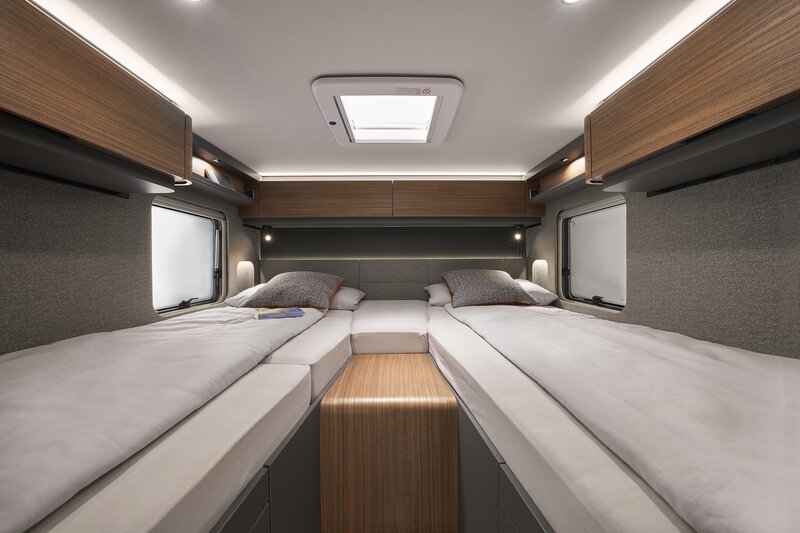 Binnenin verwelkomt de B-MC I 680 u met een stijlvol en ruim woongedeelte. De comfortabele zitgroep bestaat uit draaibare cabinezetels en een royale L-bank, waardoor een gezellige leefruimte ontstaat. Boven de cabine bevindt zich een praktisch hefbed (optie) voor twee personen, terwijl achterin twee comfortabele lengtebedden zijn geplaatst die desgewenst kunnen worden omgebouwd tot een groot tweepersoonsbed.