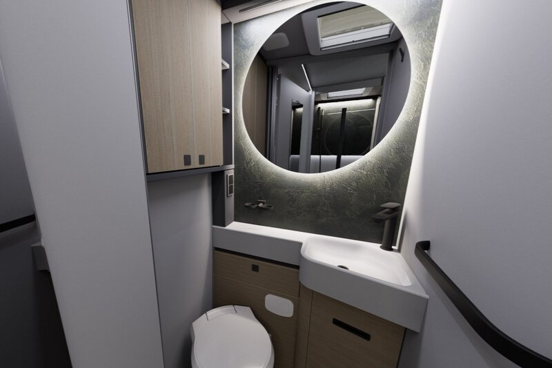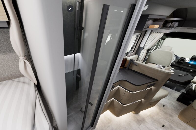 Binnenin draait alles om ruimte en gemak. Achterin vindt u twee comfortabele enkele bedden die garant staan voor een goede nachtrust. De gescheiden douche- en toiletruimte biedt extra privacy en gebruiksgemak — precies zoals u dat thuis gewend bent.
