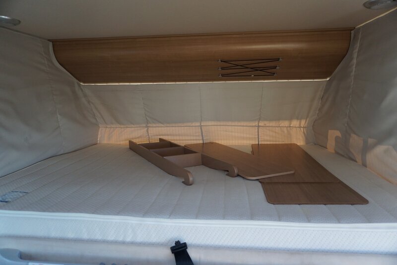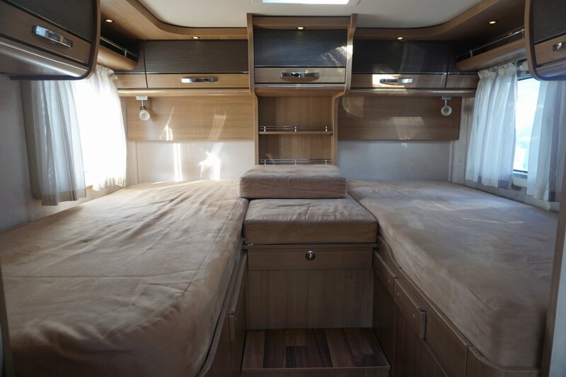 • Slapen kan comfortabel achter op de ruime enkele bedden of met vergroter tot kingsize bed en met hand bedienbaar hefbed boven cabinestoelen.
