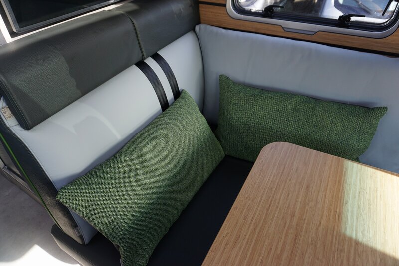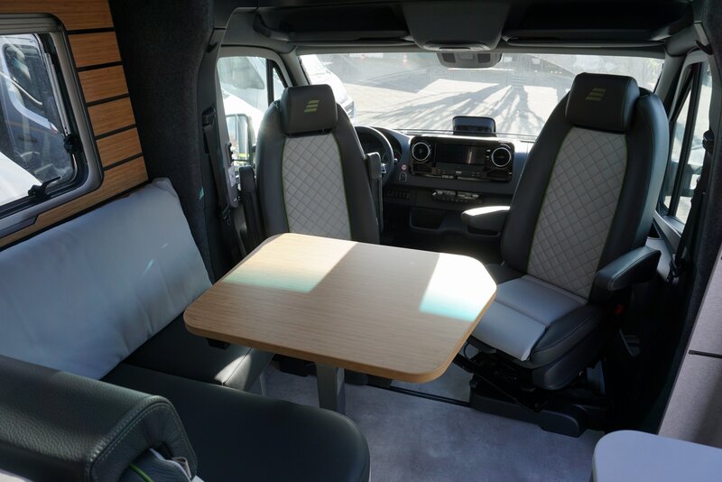 • Comfort L-zitgroep met loungekussens, in de lengte/breedte verschuifbare tafel en 2 geïntegreerde 3-puntsgordels