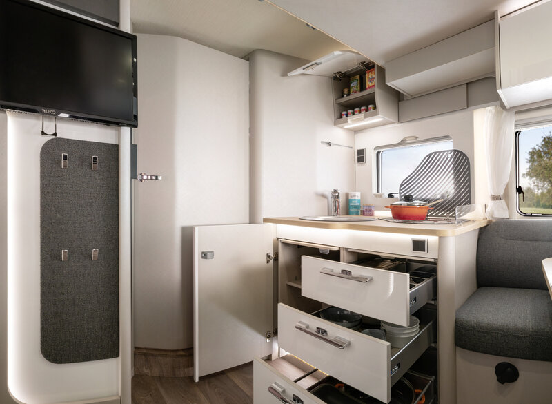 De Hymer Tramp-S 685 biedt ultiem comfort met twee eenpersoonsbedden achterin, ideaal voor een ontspannen reis. De aparte toilet- en doucheruimte biedt alles wat u nodig heeft tijdens uw avontuur en zorgt voor extra ontspanning. In het midden van de camper bevindt zich een goed ingerichte keuken en een ruime koelkast, perfect voor het bereiden van heerlijke maaltijden en het opbergen van verse producten. Deze slimme indeling wordt compleet gemaakt door de gezellige zitgroep, waar u volop kunt genieten van alles wat de Hymer Tramp-S 685 te bieden heeft.