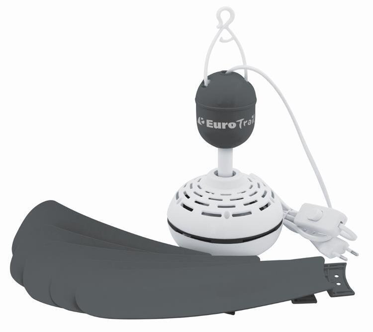 Deze opvouwbare plafondventilator is stil en heeft een hoge luchtstroom. Dankzij de afneembare bladen heeft de ventilator een klein pakvolume en is het eenvoudig om deze meenemen op reis. Montage is gemakkelijk, evenals het weer uit elkaar halen. Met de bijgeleverde haak en 3 meter lang stroomdraad kan de ventilator op meerdere plekken en op verschillende manieren worden geïnstalleerd. Deze Eurotrail plafondventilator is ideaal voor in de (voor)tent en in de caravan. Ook kan de ventilator thuis gebruikt worden.