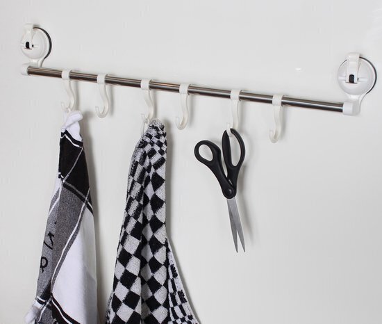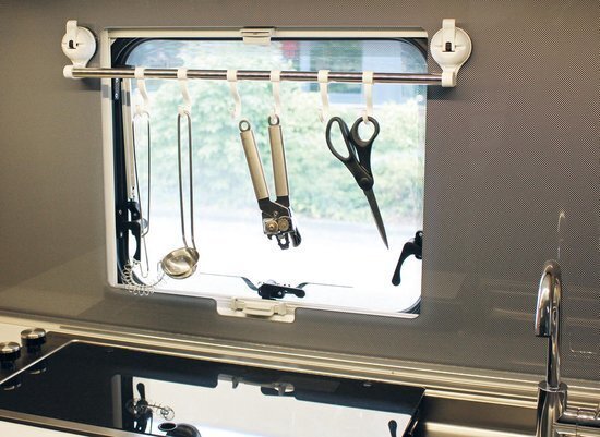 Maak je ruimte efficiënter met de Eurotrail stang met ophanghaken en zuignappen. Deze lichtgewicht stang is voorzien van zes stevige ophanghaken, maar kan ook zonder haken worden gebruikt voor nog meer flexibiliteit. Dankzij de twee zuignappen bevestig je de stang snel en eenvoudig, terwijl de capjes aan de uiteinden verwijderbaar zijn en de haken gemakkelijk op en afgehaald kunnen worden. Perfect voor binnengebruik in de keuken of badkamer, maar niet geschikt voor buitengebruik op de caravan of camper.