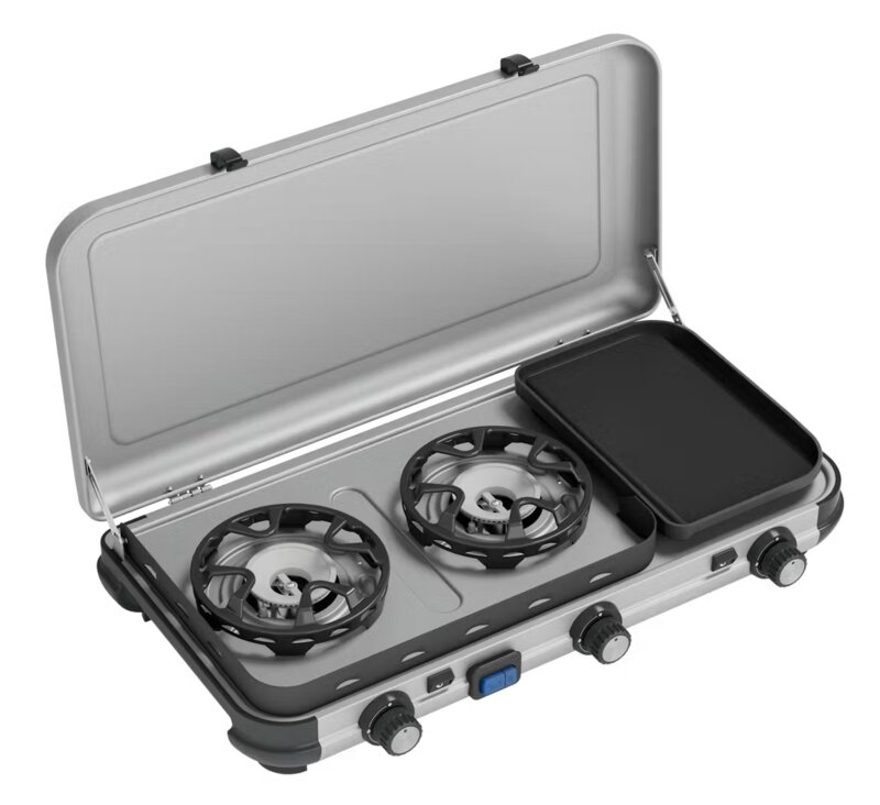 Kook efficiënt en veilig met het Campingaz Camping Kitchen 2 Multi-Cook kooktoestel. Dit compacte en draagbare all-in-one toestel beschikt over drie kookzones met afzonderlijke warmteregeling en zorgt dankzij de buisbranders voor een gelijkmatige warmteverdeling over de gegoten aluminium bakplaat. De Flameguard-technologie beschermt de vlammen zelfs bij windsnelheden tot 10km/h, terwijl de onafhankelijke piëzo-ontsteking snel en betrouwbaar aansteekt. De verwijderbare pannendragers maken schoonmaken eenvoudig en zorgen voor optimaal gebruiksgemak tijdens elke (buiten)kookervaring.